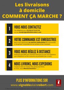 • Enlèvement de vos commandes directement au domaine, dans le respect des gestes barrières : vous stationnez votre véhicule dans la cour du domaine, votre commande vous attend devant le chai, vous vous servez !