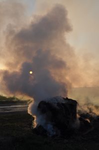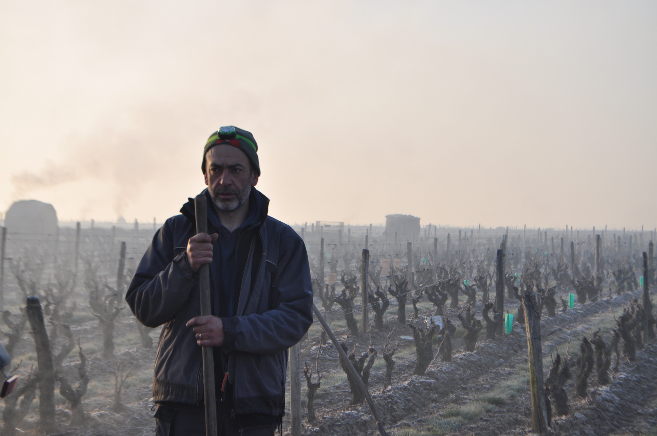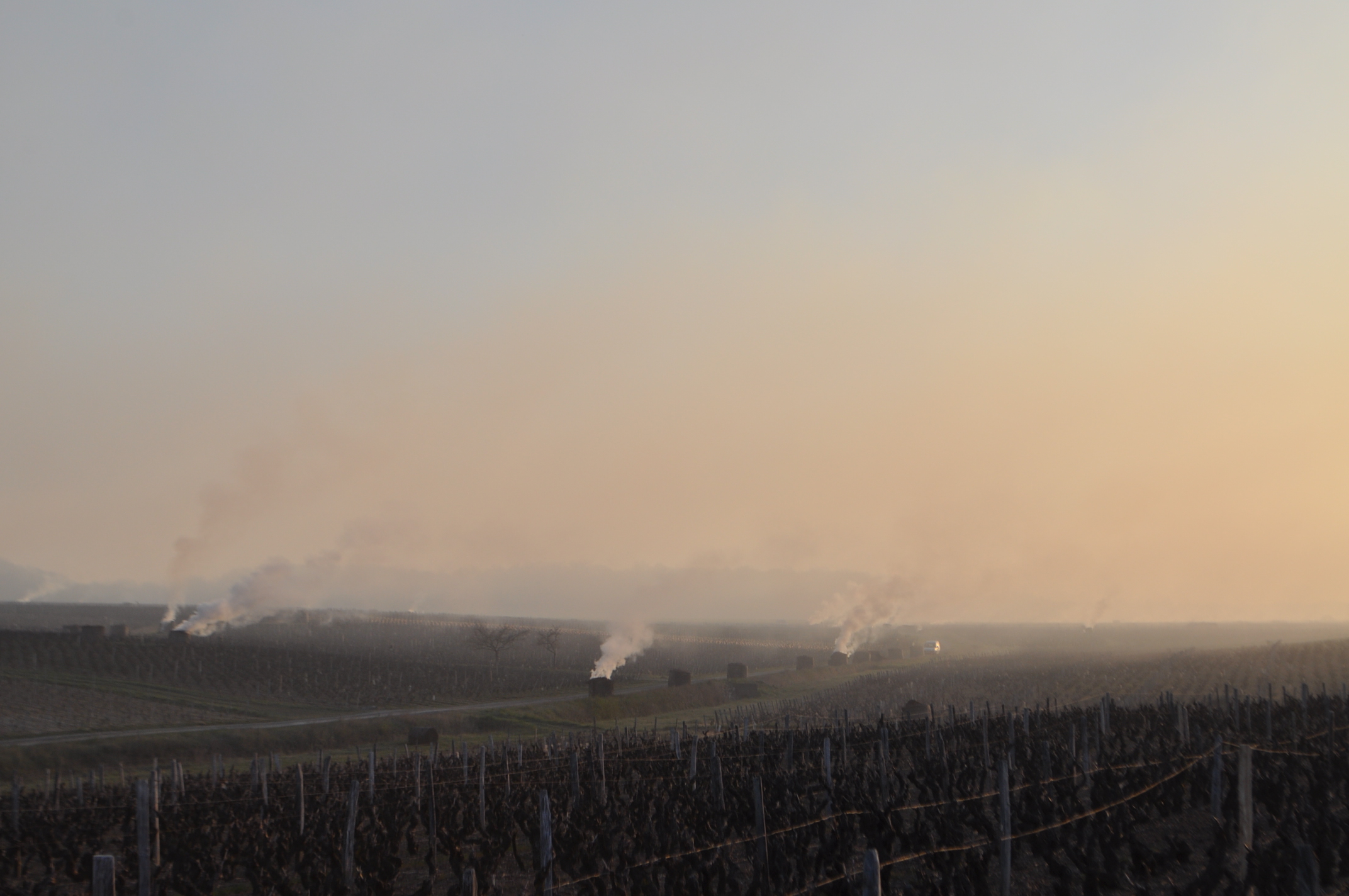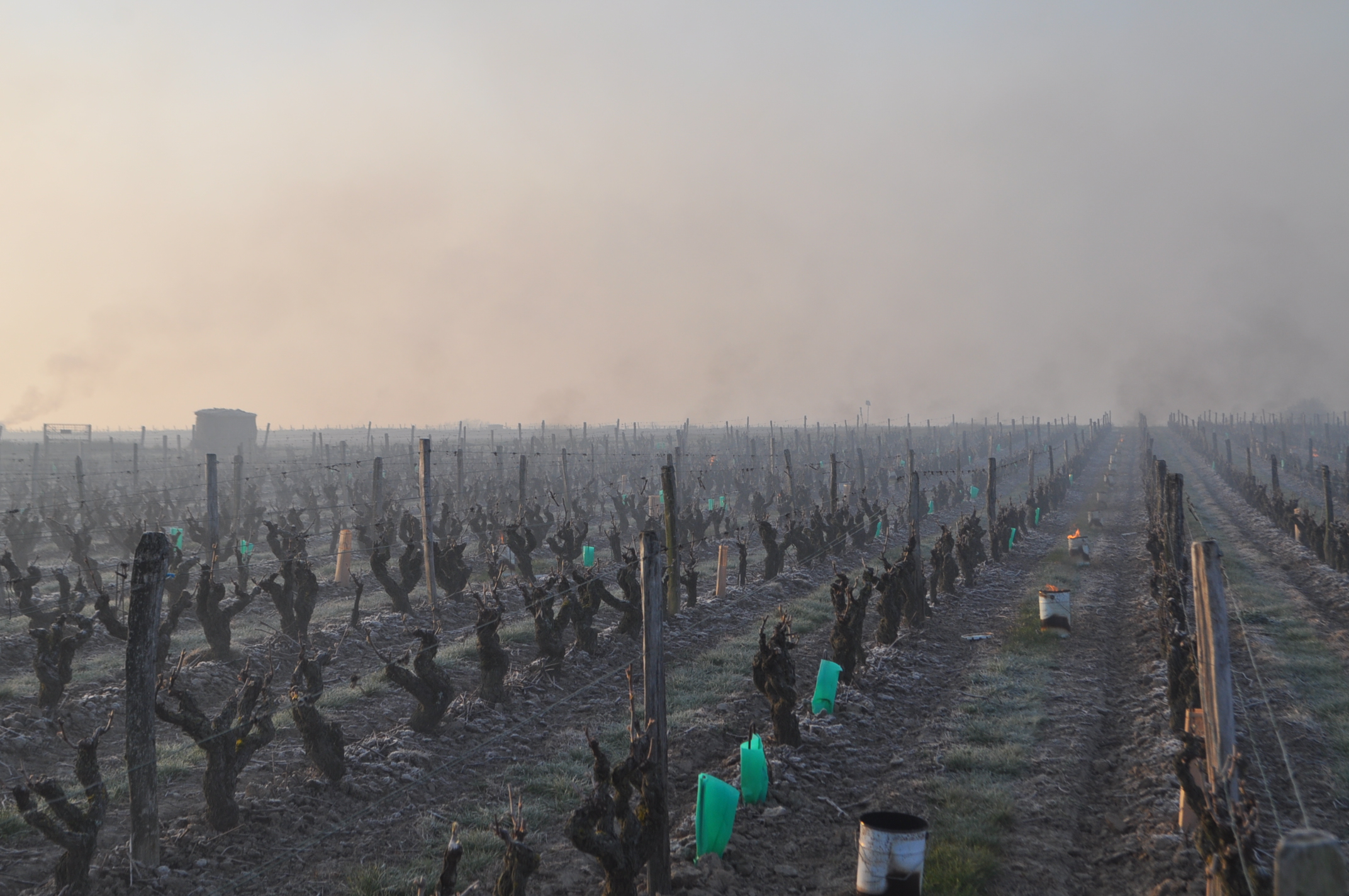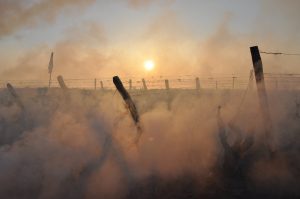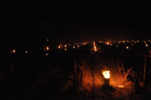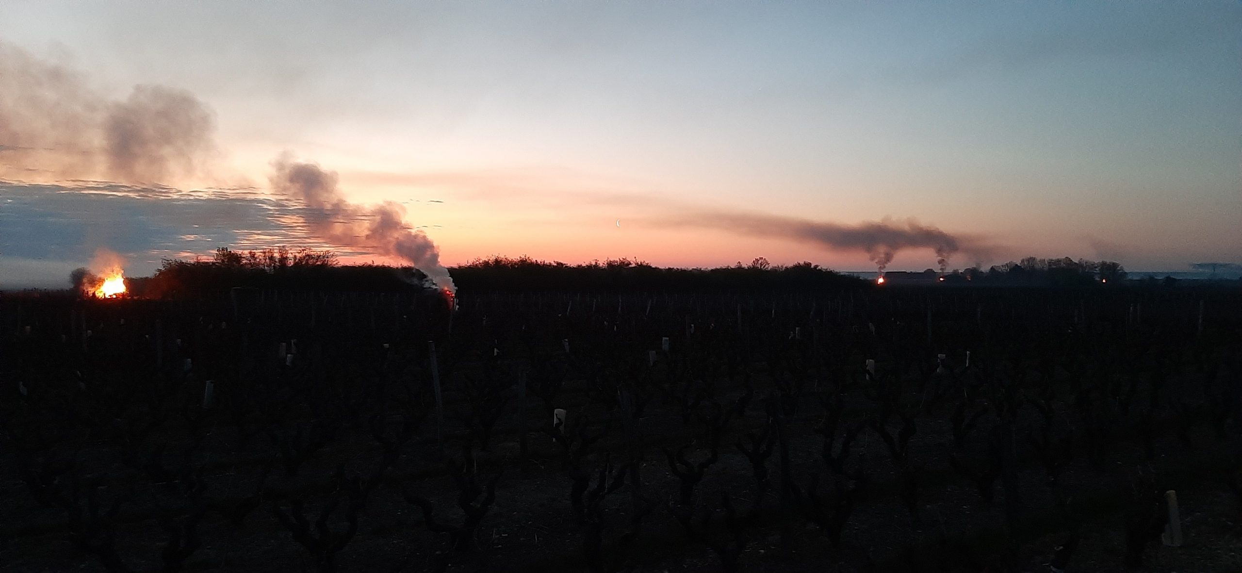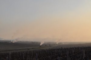 La nuit du 6 avril, les sondes météo nous confirmaient la chute des températures, jusqu’à -5°C dans l’une de nos parcelles. Nous étions donc dès 3h30 sur place pour allumer les bougies. Disposées dans les rangs de vignes, elles ont pour rôle de réchauffer l’atmosphère et tenter d’éviter ainsi le gel des bourgeons. Il est possible par ce moyen de gagner 2°C à 3°C. Puis quelques minutes avant le lever du jour et les premiers rayons du soleil, vers 6h – 6h30, nous avons allumé des ballots de paille disposés autour des parcelles dans des endroits « stratégiques » et en fonction du sens du vent, pour que la fumée se propage au-dessus des vignes à protéger. L’objectif ici est de diffuser un nuage suffisamment épais pour protéger les bourgeons gelés, des premiers rayons du soleil. En effet dans ces conditions, le froid combiné à la lumière du soleil grille les bourgeons. La fumée doit donc faire office « d’écran de protection ».