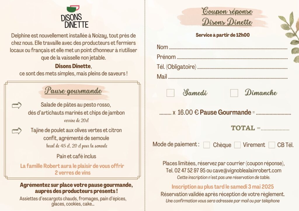 – Restauration sur place : Pause Gourmande proposée par « Disons Dinette », traiteure éco-resonsable (samedi et dimanche, sur réservation par tel ou mail, détail ci-dessous)